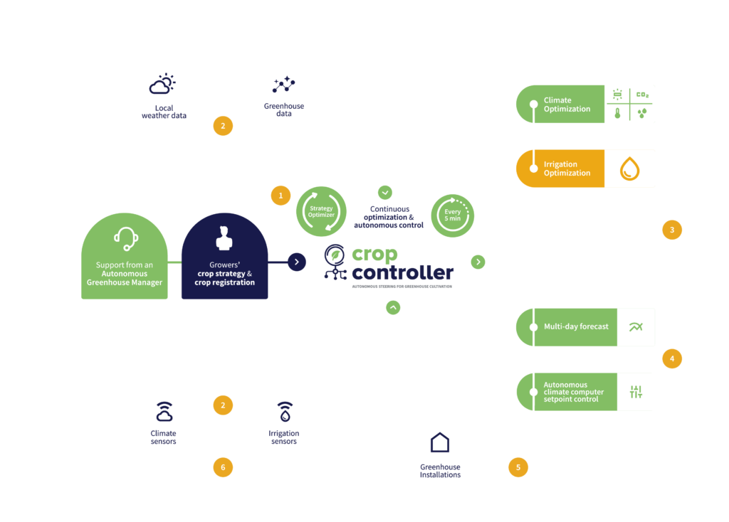 Throughout the cultivation period, Crop Controller continuously uses all available data from greenhouse sensors, climate boxes, and meteo-data providers to forecast and optimize the climate and irrigation according to the crop strategy.
